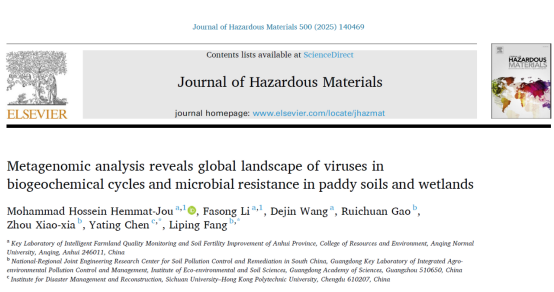近日,我校资源环境学院土壤污染修复与地力提升团队研究成果“Metagenomic analysis reveals global landscape of viruses in biogeochemical cycles and microbial resistance in paddy soils and wetlands”在中科院1区Top期刊Journal of Hazardous Materials(影响因子12.2)正式在线发表。安庆师范大学为论文第一完成单位,论文第一作者为Mohammad Hossein Hemmat-Jou博士和李法松教授,四川大学陈娅婷副教授与广东省科学院生态环境与土壤研究所方利平研究员为论文通讯作者。