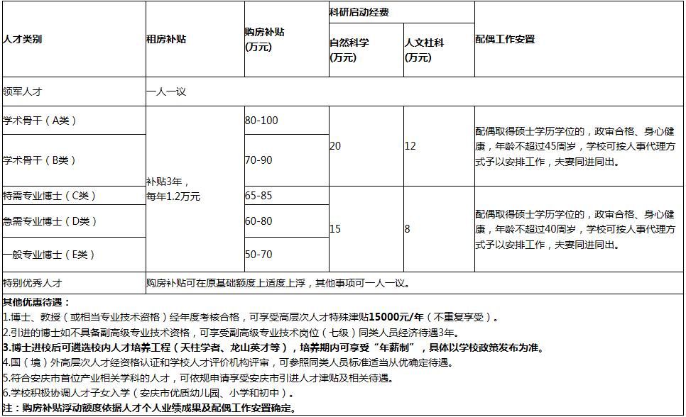 引进的全职高层次人才入安徽省事业单位编制,除了享受正常工资福利待遇外,学校还提供(租)购房补贴和科研启动经费等待遇,具体见下表: