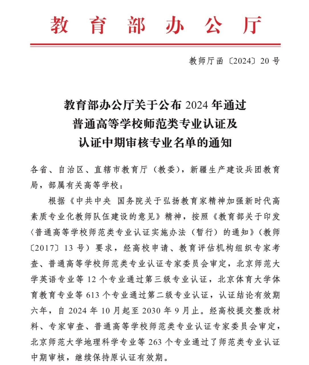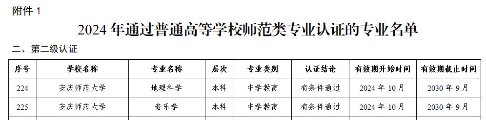 近日,教育部正式发布了《教育部办公厅关于公布2024年通过普通高等学校师范类专业认证及认证中期审核专业名单的通知》。我校地理科学专业有条件通过教育部师范类专业中学教育第二级认证(https://www.aqnu.edu.cn/info/1004/1746171.htm)。通过第二级认证专业的师范毕业生,可由高校自行组织中小学教师资格考试面试工作。本次认证通过是对我校地理科学专业建设成效的充分肯定。