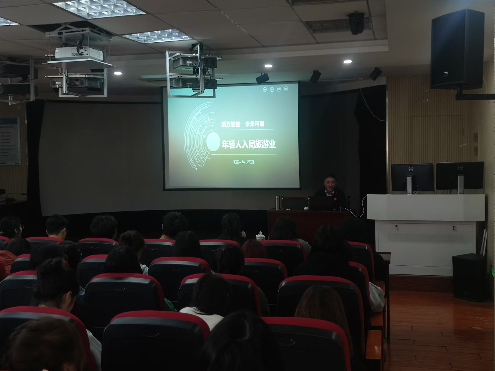 首先,张凯院长围绕安徽省文化旅游资源的特色、市场发展趋势、科学旅游规划的核心理念及应用路径等进行了细致分享。他结合丰富的案例和生动的讲解,将复杂内容深入浅出地传递给在场学生,使大家受益匪浅,对旅游规划行业的现状和发展有了更全面的理解。随后,郑珏理总经理从青年视角切入,深入探讨了年轻人从事旅游行业的独特优势和挑战。他特别强调了理论知识与实践技能结合的重要性,鼓励大家在学校学习中积累实践经验,将个人职业规划与国家的旅游强国战略相结合,为旅游业高质量发展注入新的动力。