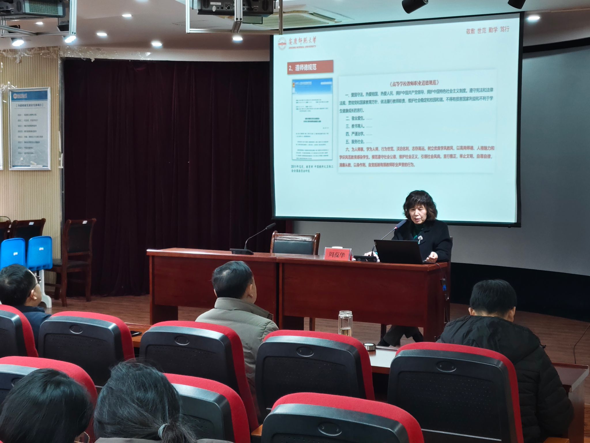 12月11日,资源环境学院在F411报告厅举办师德师风专题报告会, 2022年学校“三全育人”最美老师之“教书育人”最美老师、校关工委秘书长周葆华教授以“浅谈新时代高校师德师风建设”为主题作报告,学院全体教职员工参加报告会。