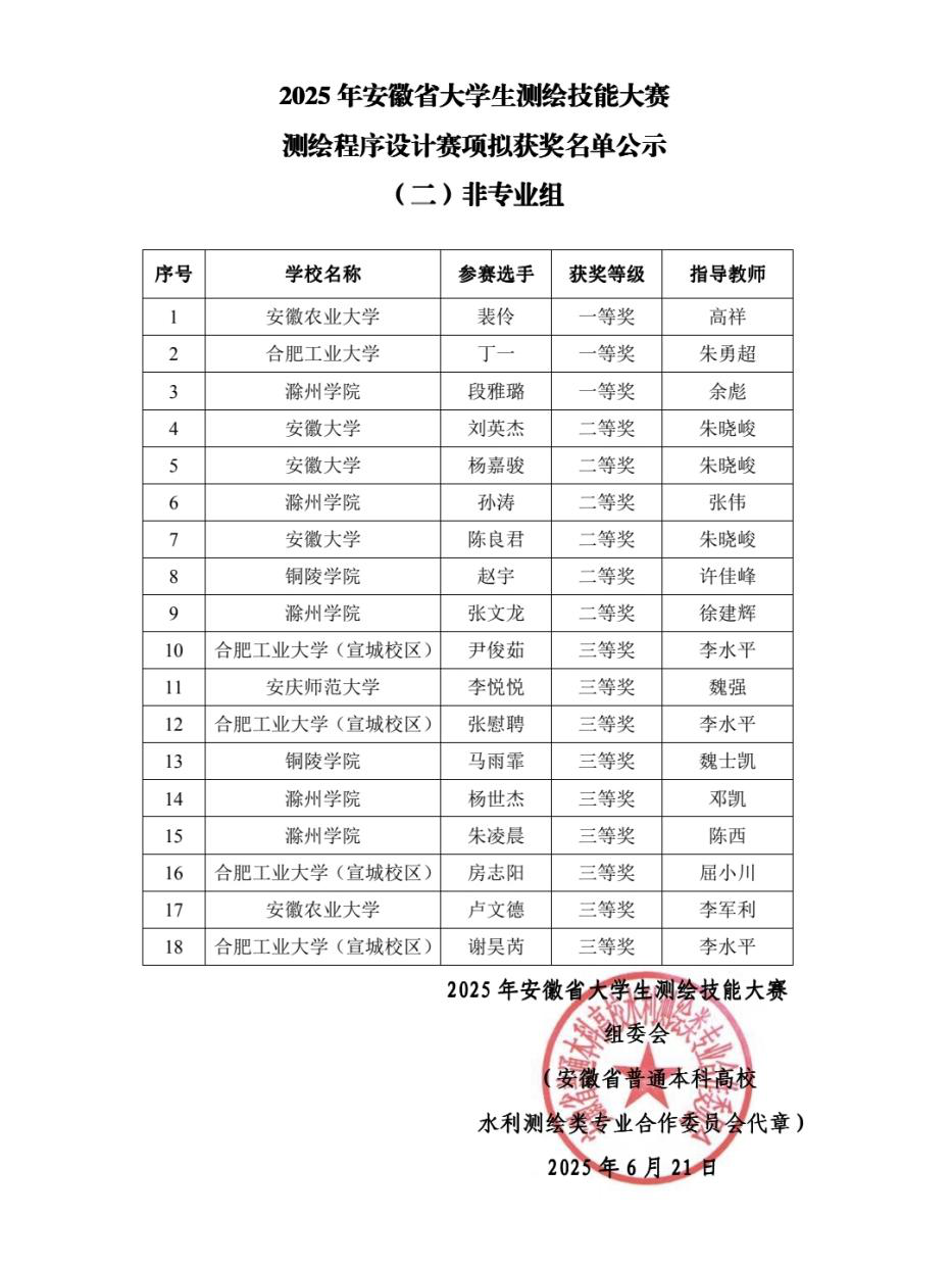 2025年6月20日至22日,安徽省大学生测绘技能大赛在宿州学院成功举办。本次赛事由安徽省教育厅、宿州学院、安徽理工大学等单位联合主办,作为省级重要赛事(B类赛事),旨在提升省内测绘学科人才的程序设计与实践应用能力,通过算法设计、程序编写、成果展示等多元化项目,全面检验参赛者的专业技能与创新思维。