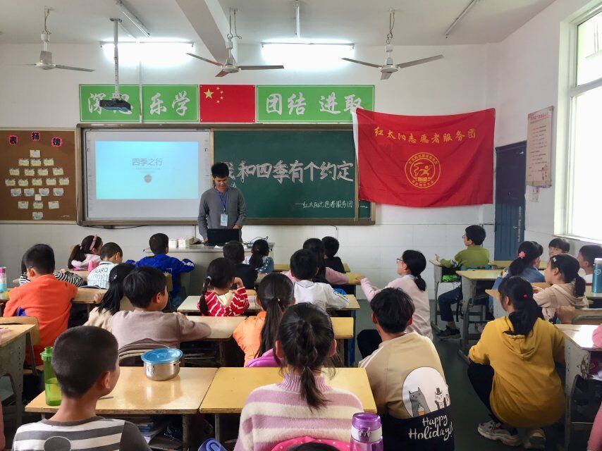 中国青年网安庆10月24日电(通讯员 吴晨 刘君艳)“百花风中摇,碧叶雨中戏,枯叶风中舞,白雪盖大地”古来山川之美,美在四季。为开阔孩子们的视野,领略大自然的魅力。10月17日,安庆师范大学资源环境学院红太阳志愿者服务团来到十里中心小学,与留守儿童开展“四季之行”主题志愿活动,跟随着志愿者的步伐,小朋友们领略了四季的美景。