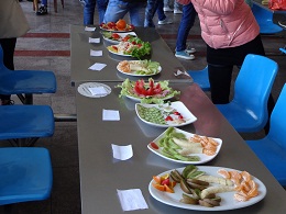 参与此次活动的选手来自我院大一大二各班级,每位选手都怀揣着信心参与活动,希望在比赛中一展自己的惊人厨艺。本次比赛要求选手们在规定的时间内做齐一份水果拼盘和热菜,并向评委介绍所做作品的名字和特色。比赛开始后,选手们用不同的水果拼出美丽的图案,并加以修饰摆盘,色香味俱全,让人顿时食欲大增。热菜是真正考验选手厨艺的一个重要环节,大家运用熟练的刀工将食材切放得整齐有序,鱼、肉、蔬菜在选手的精湛的厨艺下变成一道道美食。有的选手在面对烧菜时的紧急情况时,仍不慌不乱、沉着面对,但也有的选手在失误中烧出一盘糊了的“美食”。最后的评比现场上,各种精美的熟食与水果冷盘让评委与观众们都看花了眼,在大家的一片赞叹中,我院大二的一组选手夺得了最终的资环“食神”称号。