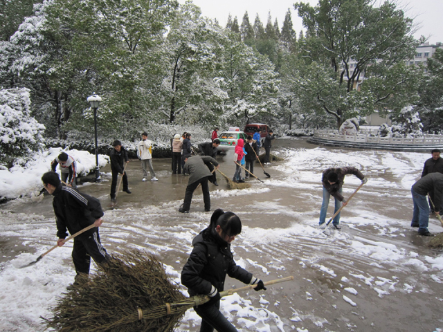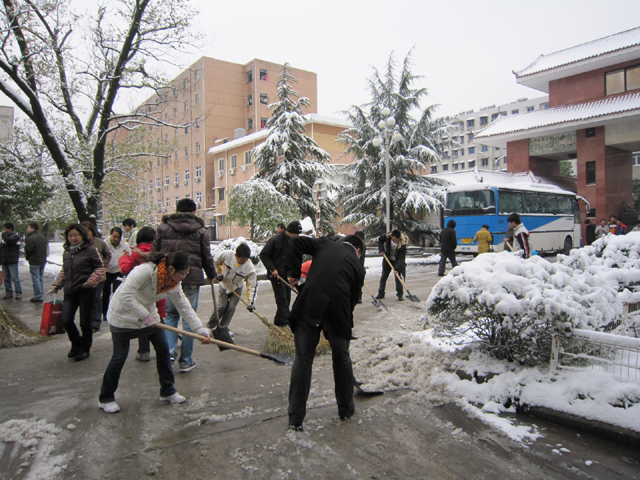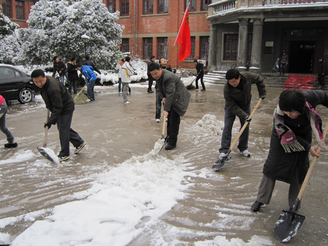 11月17日上午,我院师生进行了一场扫雪活动,党政领导李经田、周葆华、徐志兵、王开友亲自带头和同学们一道清扫路道。共青团组织开展了主题团日活动,加入到了清除积雪的队伍中来。经过一上午的努力,将红楼前至校大门处主要路段的积雪铲除干净,为师生的通行带来了方便,保障了交通安全。在我院师生的的共同努力下,菱湖校区主干道已恢复正常通行,缤纷雪季,我院师生以实际行动谱写着一曲团结奋进的赞歌。