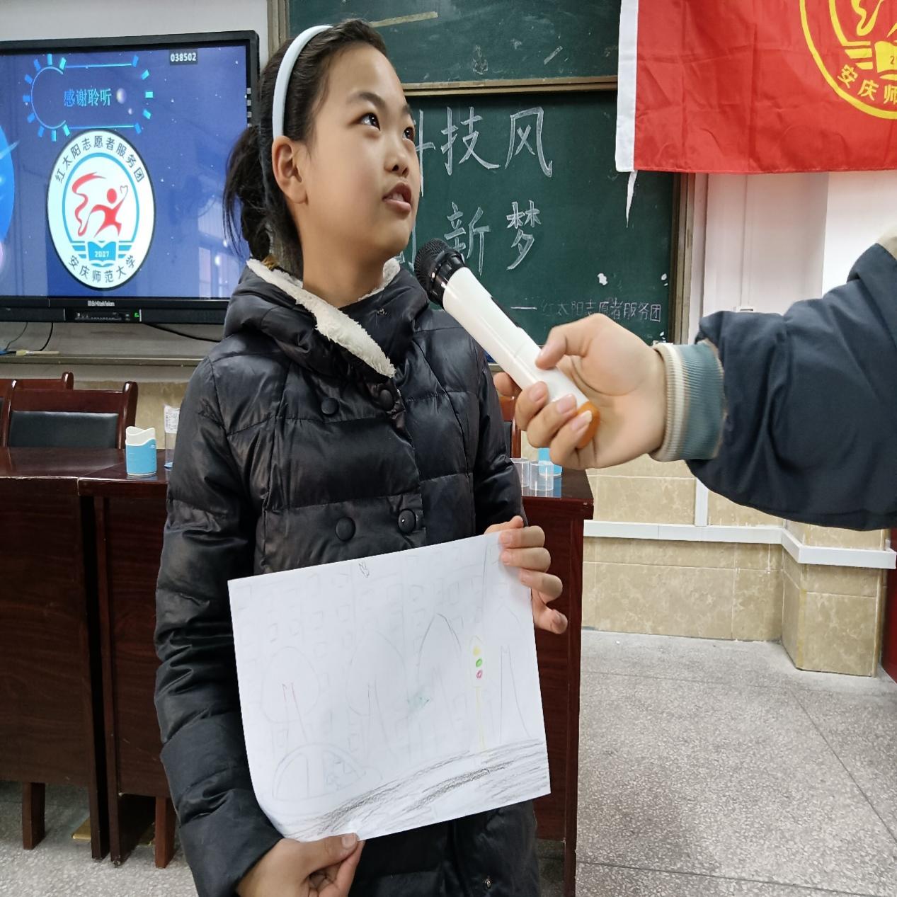 为拓展学生想象力,巩固所学知识,培养他们的科学兴趣,主讲人组织学生开展“畅想未来”绘画活动,由志愿者带领学生描绘出自己心中的未来模样,“我认为在未来人工智能会极大程度服务人类,让人类的生活更加便捷。”其中马玉龙同学这样解释自己的作品。