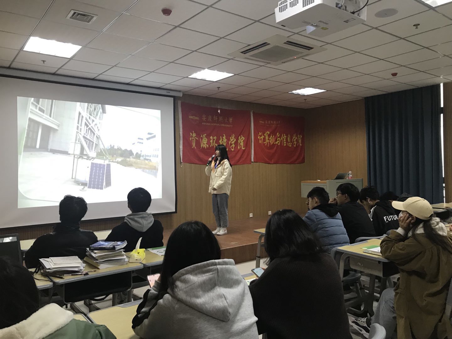 宣讲内容主要围绕节能减排大赛的赛事简介、赛事要求、往届风采和联系方式四个方面。资源环境学院“绿动未来”科创服务中心的工作人员围绕这四个方面向同学们做具体介绍。宣讲会以一个简短的介绍视频开始,通过视频的丰富内容吸引各位同学的注意,激发同学们的兴趣。接着,工作人员展开详细介绍,从赛事作品的分类,到作品的格式要求,再到历年的优秀作品展示和获得成果,多角度地向同学们展示此项赛事的魅力。宣讲结束后的自由提问环节,科创工作人员耐心地为同学们解答疑惑,帮助同学们清除心中对参赛的困惑。