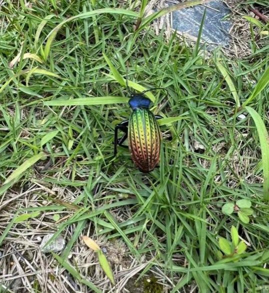 硕步甲,又名大卫步甲,鞘翅目步甲科昆虫,有着“昆虫中的猎豹”之称。体长一般在33-40毫米,体宽一般在11-14毫米。头部、触角和足均为黑亮色;胸部背面为藏蓝色,身披雕刻般的“盔甲”,在阳光下呈现五彩的金属光泽,多捕食鳞翅目幼虫、蜗牛、蛞蝓等小型软体动物,也捕食蝗虫,是农田重要捕食性天敌,益虫。
