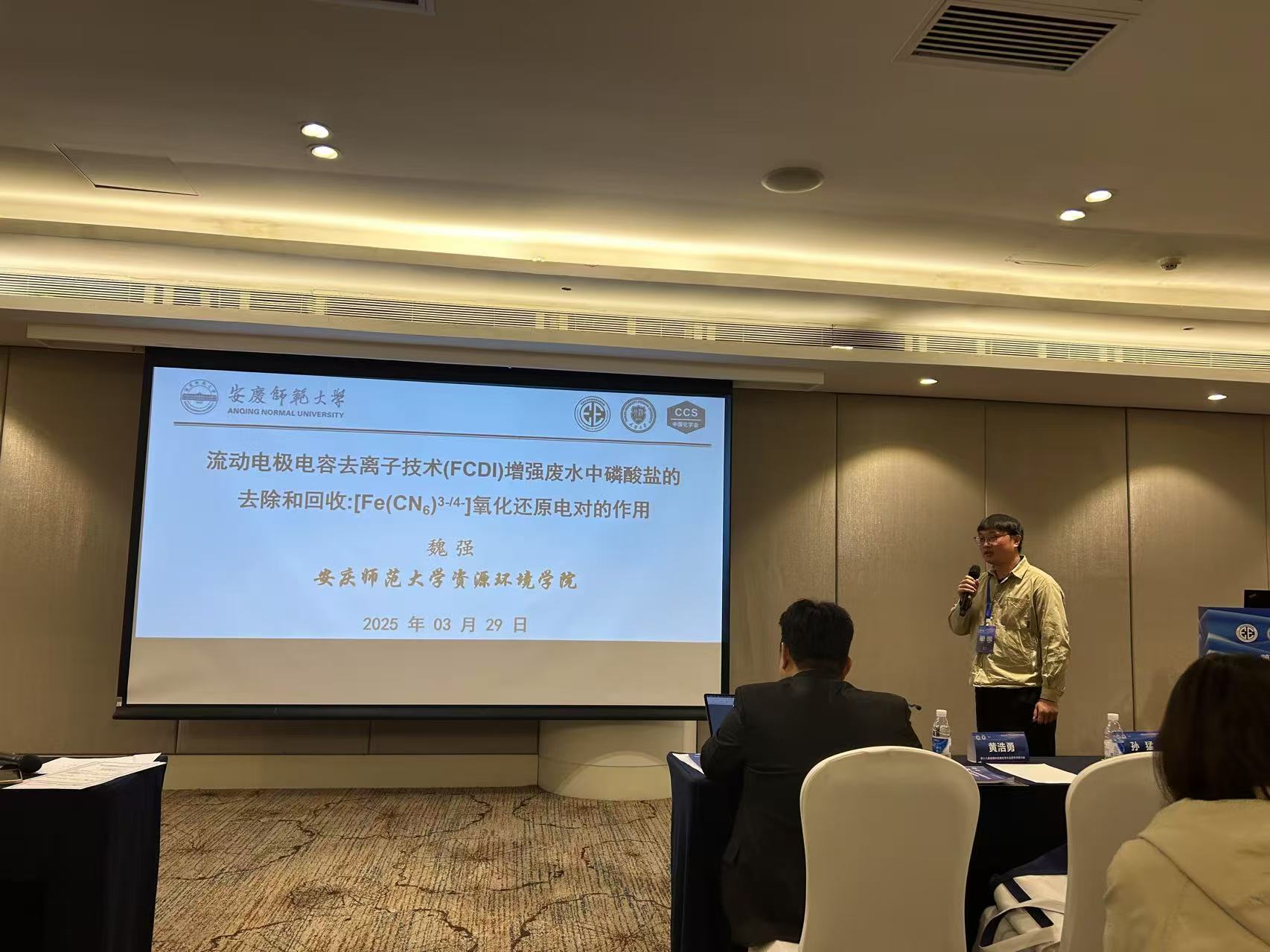 3月29日下午魏强副教授在“膜分离理论与技术”分会场做了题为“流动电极电容去离子技术(FCDI)增强废水中磷酸盐的去除和回收:[Fe(CN6)3-/4-]氧化还原电对的作用”的学术报告,主要分享了其利用氧化还原电偶在FCDI工艺中的研究成果。报告受到了在场学者的广泛关注与一致好评,魏强副教授还针对与会者的提问进行了细致的回答,并期待与其它机构加强学术合作。