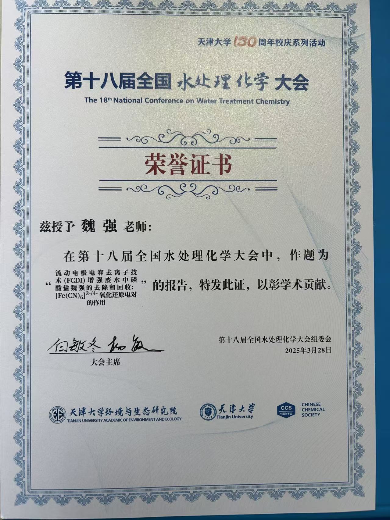 2025年3月28日-30日,第十八届全国水处理化学大会暨学术研讨会在天津举办。本次会议由天津大学和中国化学会应用化学学科委员会主办,以“减污降碳扩绿目标愿景下水处理化学的创新发展”为主题,围绕我国生态文明建设和双碳战略需求,深入探讨水处理化学领域新理论、新技术、新装备、新材料和新模式,以减污降碳扩绿的理念引领水处理技术的创新与低碳发展。我院魏强副教授受邀参加该会议,认真聆听了来自天津大学、同济大学、中国科学技术大学、华东理工大学等多所高校专家的主旨报告,并与行业内的知名专家学者进行了深入的学术交流。