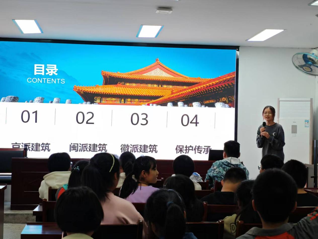 活动伊始,主讲人用生动翔实的语言向同学们分别讲述京派建筑、闽派建筑、徽派建筑的历史与建筑风格,其中对于古建筑的作用和卯榫结构的讲解激发小朋友们强烈的兴趣。接着,地理科学专业2024级(2)宋丽文将三种古建筑进行对比,更加展现出每种古建筑的独特风格与功能用途。最后,她向小朋友们介绍古建筑保护所面临的难题和小学生保护古建筑具体且可行的方法,鼓励小朋友们积极地保护古建筑。“老师,我太喜欢这次的活动啦!我学会许多有关建筑的小知识,十分有意义。”金雨婷小朋友对这次活动评价道。