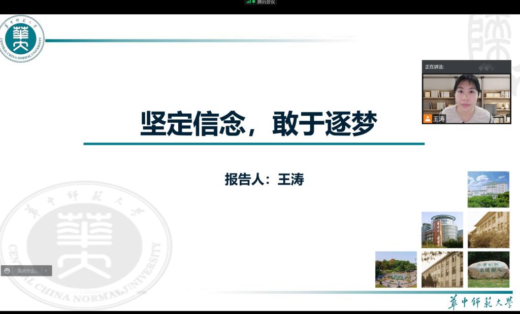本次报告会的主题是“坚定信念,敢于逐梦”。王涛同学与参会同学们分享了自己在大学里如何学好专业知识,怎样备考研究生,最终圆梦进入华中师范大学攻读硕士,直至现今入编苏州市一所重点中学的成长过程。鼓励同学们要树立坚定地信念,胜不骄,败不馁,不断努力去追逐自己心中的梦想。