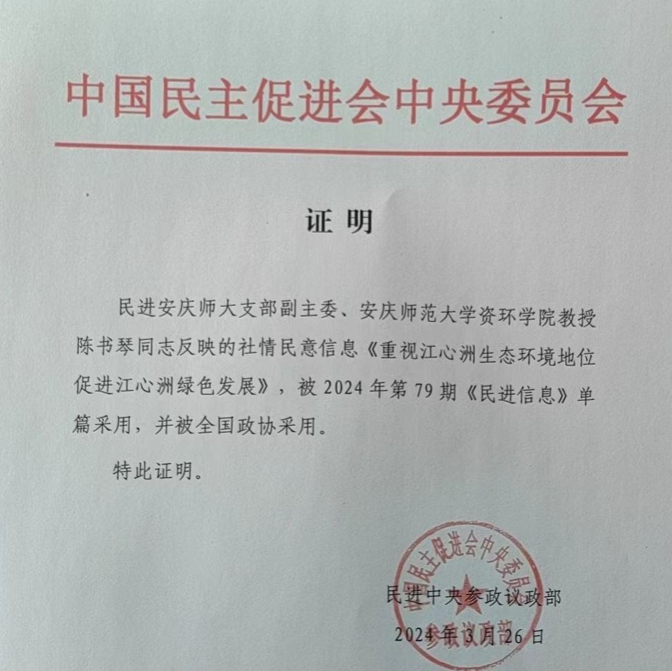 近日,从中国民主促进会中央委员会参政议政部发来喜讯,由我校陈书琴教授调查报告成果形成的社情民意《重视江心洲生态环境地位 促进江心洲绿色发展》被全国政协和民进中央《民进信息》采用。