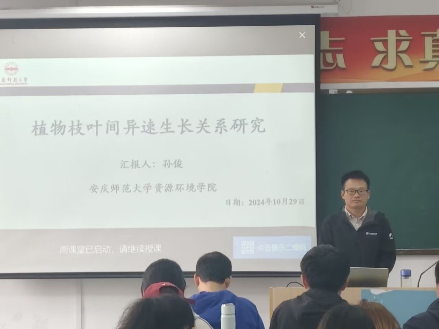 为增强地理科学专业学生的学术素养,培养学生的实践创新能力。资源环境学院青年教师孙俊博士于2024年10月29日上午在F204作了“植物枝叶间异速生长关系研究”的学术报告,部分地理科学专业研究生和本科生参加了讲座。