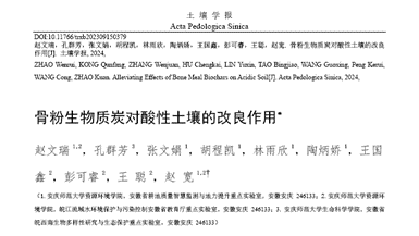 近日,我校资源环境学院赵文瑞博士以第一作者在国内土壤领域顶级期刊《土壤学报》(卓越期刊、《世界期刊影响力指数(WJCI)报告》Q1区,影响因子5.772)发表题为“骨粉生物质炭对酸性土壤的改良作用”的论文,安庆师范大学为论文第一完成单位和通讯单位。
