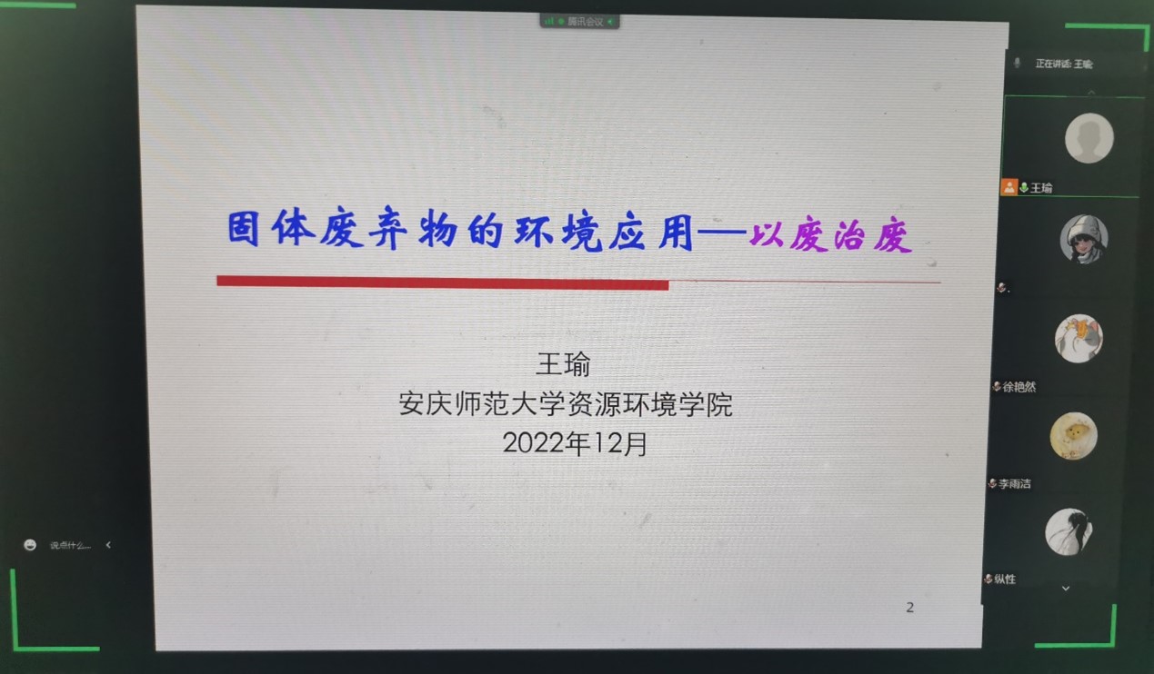 2022年12月21日,资源环境学院王瑜博士利用腾讯会议(会议号:600-181-205)在线开展了题为“固体废弃物的环境应用”学术报告。资源环境学院环境科学与工程专业50多位同学参加了本次报告会。