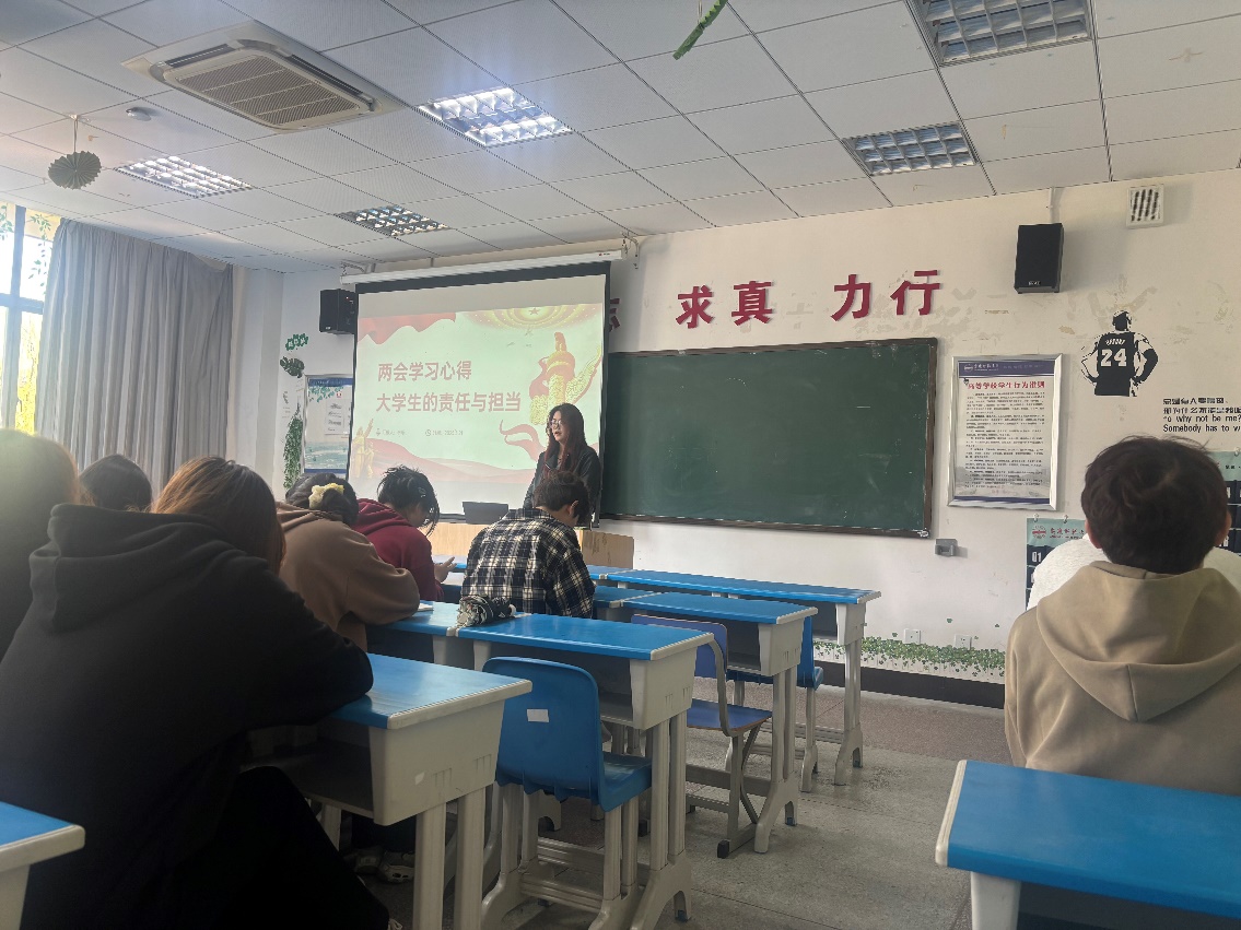 为提升大学生政治素养,增强新时代大学生的责任感和使命感, 3月21日资源环境学院2024级旅游管理专业1班在F205召开“两会知识分享”主题班会,会议由辅导员杨煜主持,本班级全体同学参加。