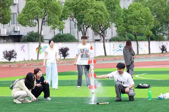 在发射环节,志愿者们与学生们一起将水火箭放置在发射架上,向瓶内注水并充入一定压力的空气,随着压力逐渐增大,只听“嗖”的一声,软木塞被推出,水流高速喷出,火箭如同离弦之箭般冲向天空。孩子们的欢呼声和惊叹声此起彼伏,整个校园都沉浸在一片欢乐的海洋中。“太神奇了!我看着自己做的火箭飞起来,感觉自己像个小科学家。” 一位参与实验的学生兴奋地说道。发射成功后,志愿者们还引导学生们观察并记录发射角度、气压值、飞行时间和落点距离等数据,让他们在实践中学习科学知识,感受科学的魅力。