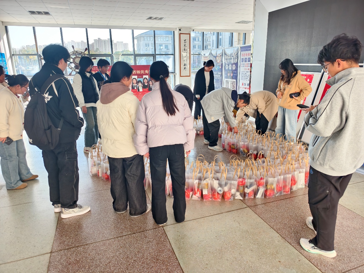 11月26日,资源环境学院在学院一楼大厅组织考研助力活动。活动现场气氛热烈,秩序井然。橙子、饮料、独立包装的能量棒以及祝福贺卡等物资被分门别类,整齐摆放。一份份满载着鼓励与期待的“加油包”递到考研学子手中,承载着全院师生对他们的鼓励与期待。