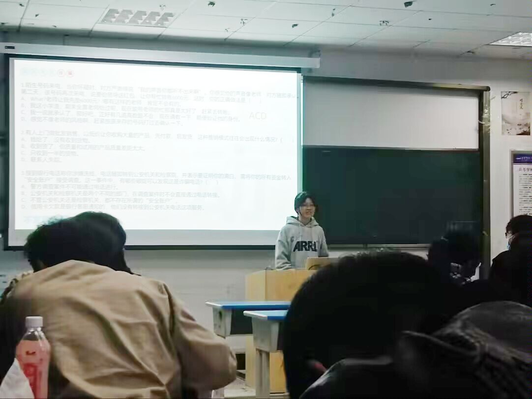 会议期间,王静如指出多个大学生被骗事件,点明多种诈骗手段,并且提问了关于电信诈骗的相关问题,同学们踊跃回答,积极参与。最后,王静如还现场传授了一些防诈方法,呼吁大家在生活中要提高警惕,对恐怖分子的花言巧语,要学会辨别,遇到疑问直接拨打官方电话咨询或联系辅导员。